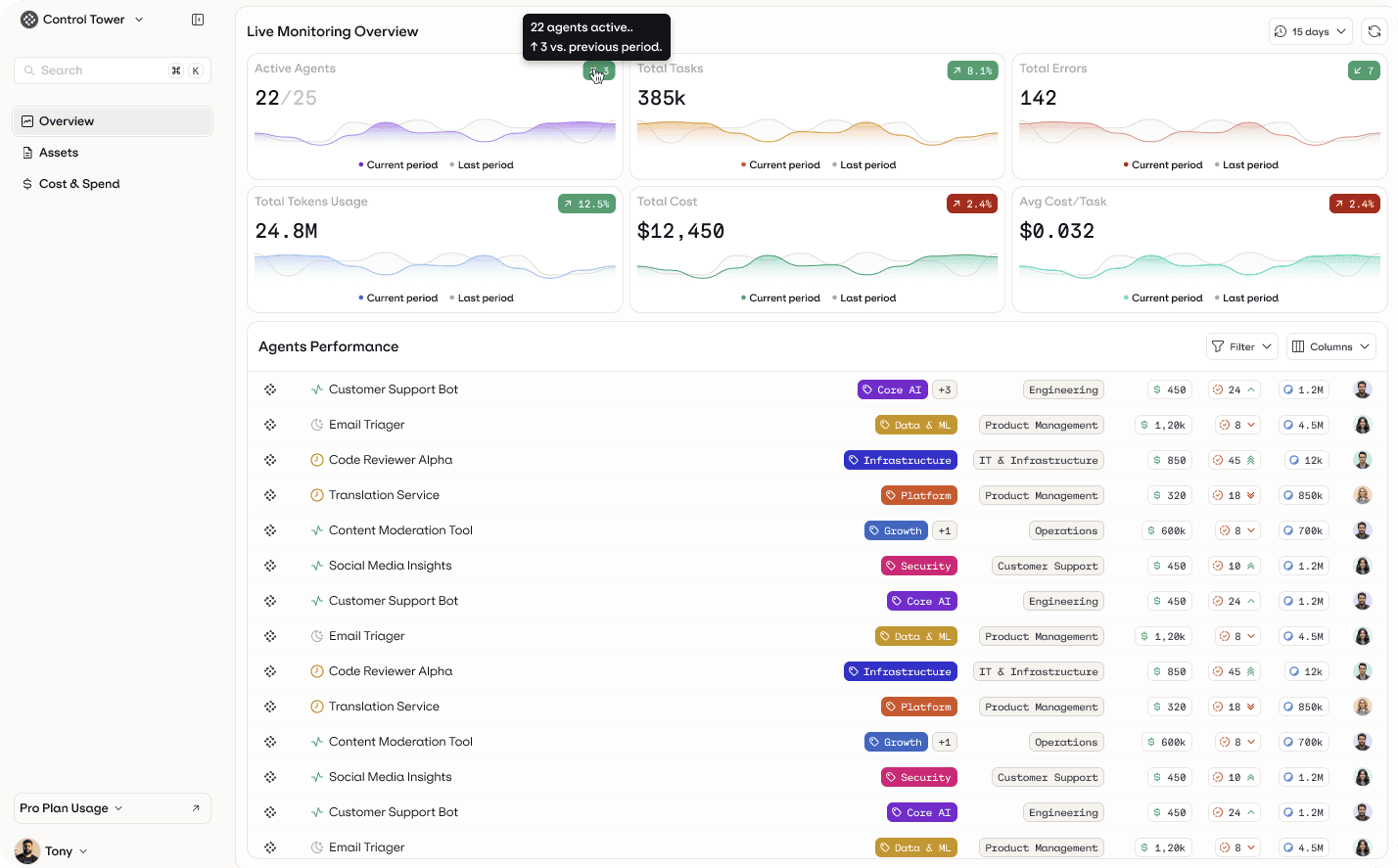 This is where the concept of an agent control plane emerges. At Orq.ai, we call this layer the Control Tower. It's a centralized operational view that connects agent behavior, spending, and governance across the organization. A Control Tower surfaces the agent “asset inventory” across the org, covering both internally built agents and those embedded in third-party SaaS platforms. It also includes rollups like total cost and token usage, plus spend over time and per-agent cost breakdowns, so teams can see what’s running and where the spend is coming from.