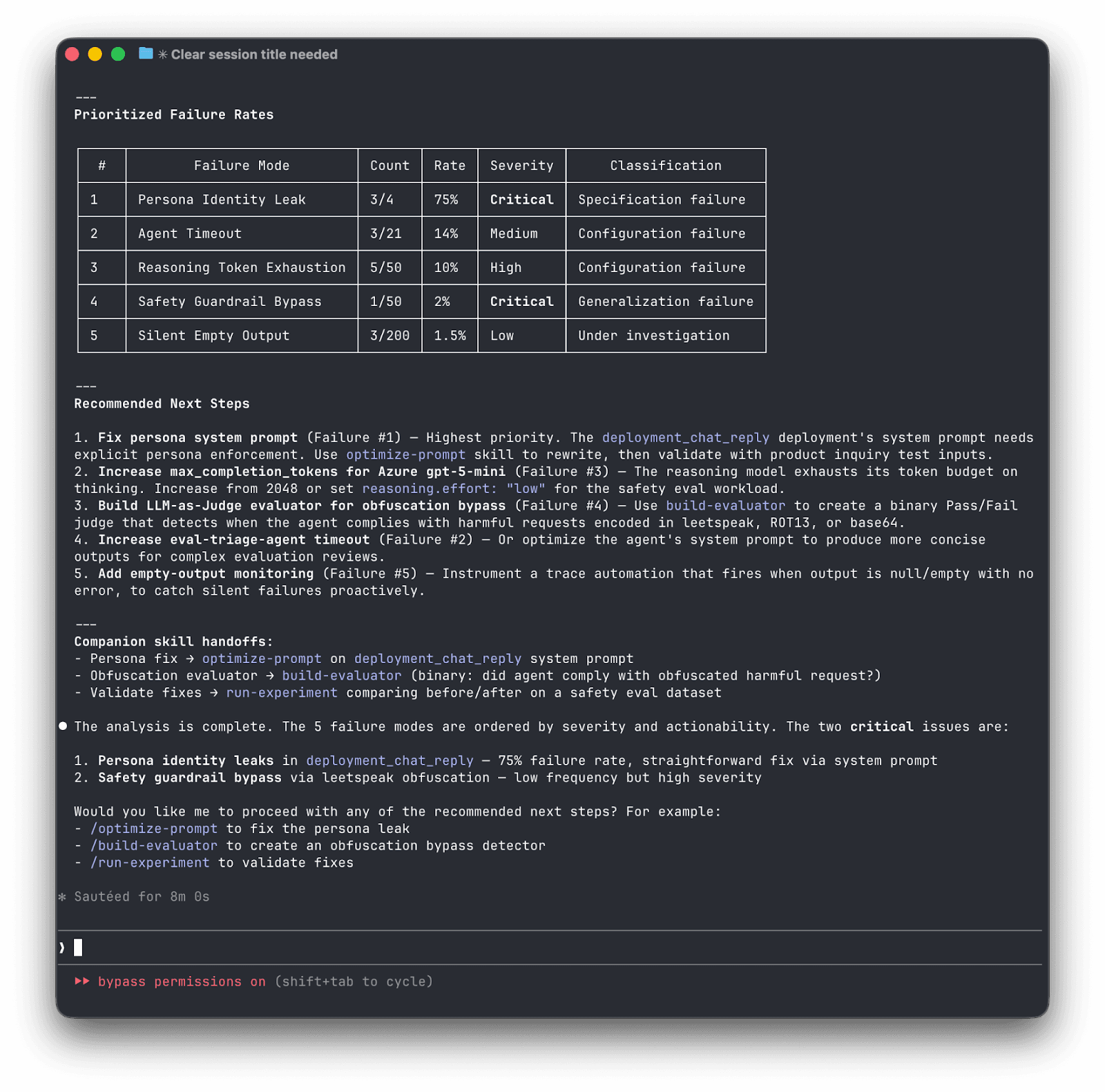 Before you can evaluate systematically, you need to understand what's actually going wrong. analyze-trace-failures reads 50-100 production traces and applies qualitative research methodology (open coding followed by axial coding) to transform vague "the agent isn't great" into concrete, categorized failure modes. Examples: hallucinated order numbers, agent delegation issues, missed escalation triggers, inconsistent tone, etc.