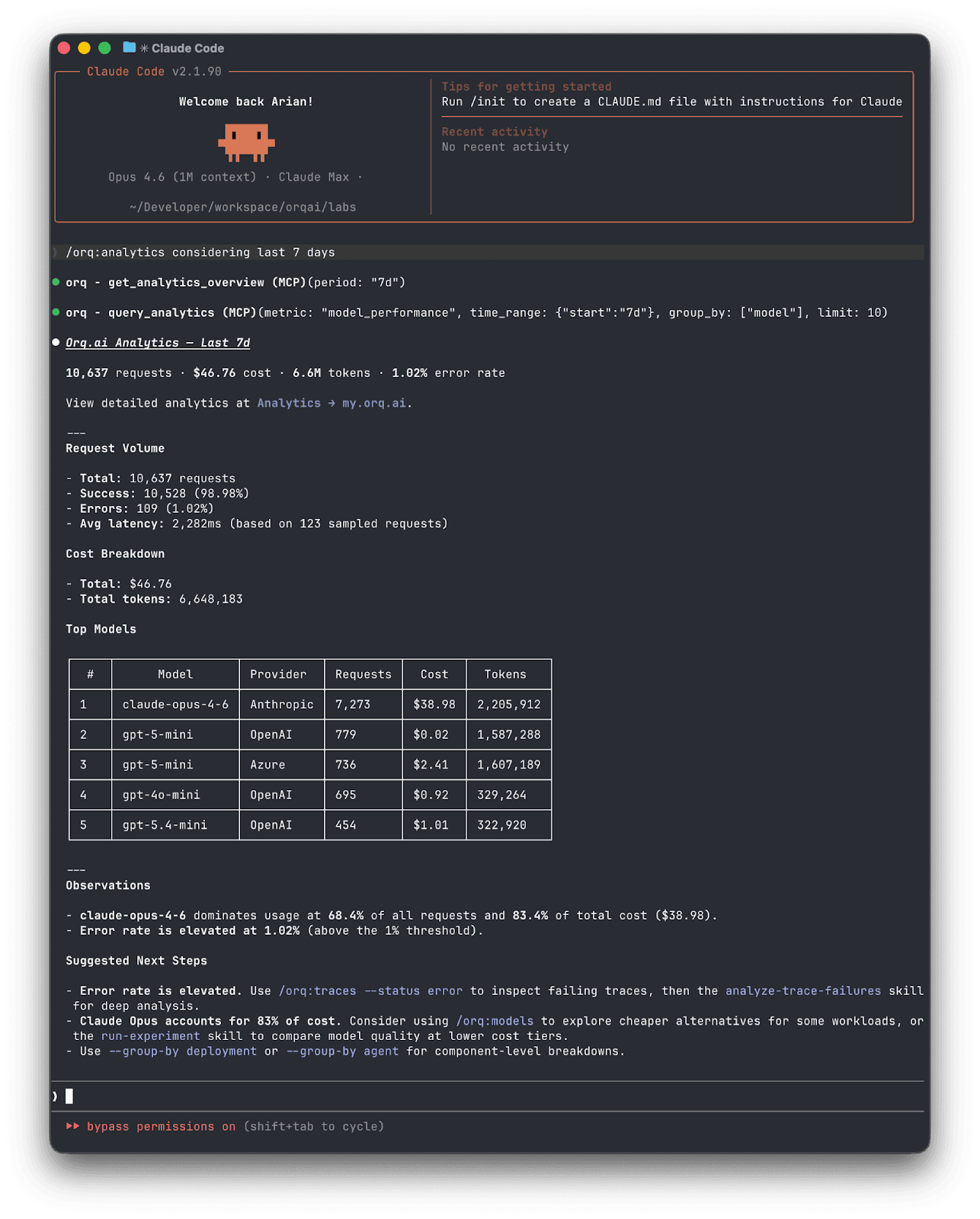 /orq:quickstart— walks you through setup and gives a guided tour of available skills/orq:workspace— shows your agents, deployments, datasets, and experiments at a glance/orq:analytics— surfaces usage patterns, costs, and error rates so you can spot issues before they escalate/orq:traces— queries and summarizes production traces/orq:models— lists available AI models and their capabilities