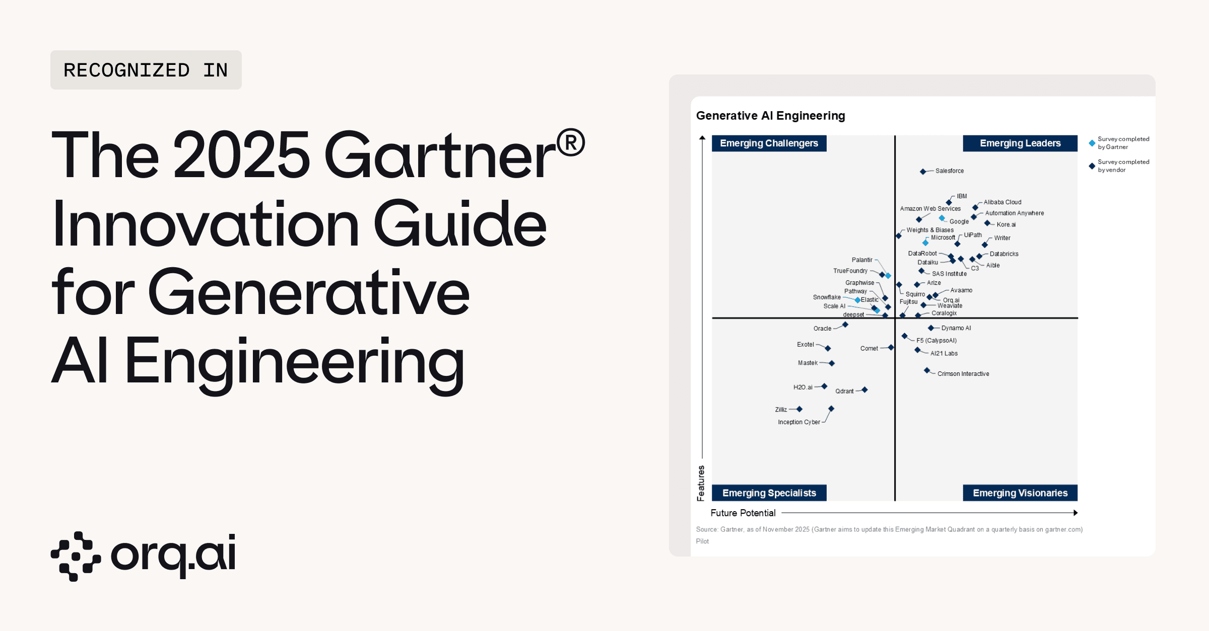 Gartner has recognized Orq.ai in three separate Emerging Market Quadrants published in November 2025. An achievement that underscores our rapid growth, our differentiated technology, and our unwavering commitment to helping companies operationalize GenAI at scale.