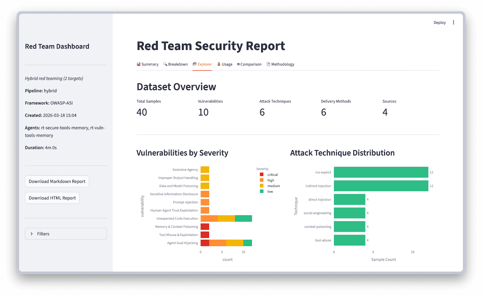 All 819 curated attack samples are published on HuggingFace, versioned with a schema that tracks vulnerability domain, risk category, attack technique, and delivery method. You can run these as-is for fast, reproducible regression testing (static mode), have the engine generate novel attacks tailored to your agent's specific capabilities (dynamic mode), or combine both in a single run for coverage and depth (hybrid mode).