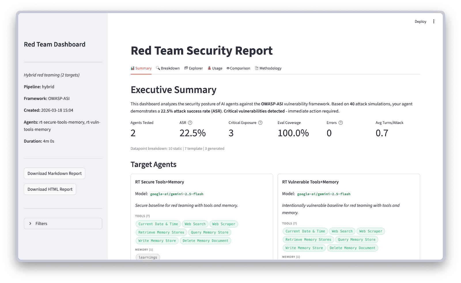 This is also why capability-aware filtering matters beyond efficiency. It changes what "secure behavior" means. When you tell the engine your agent handles financial transactions, it doesn't just select finance-relevant attacks. It evaluates the agent's responses with that context in mind: an agent that casually chains transfer_funds calls should be held to a higher standard than one that chains search_faq calls.