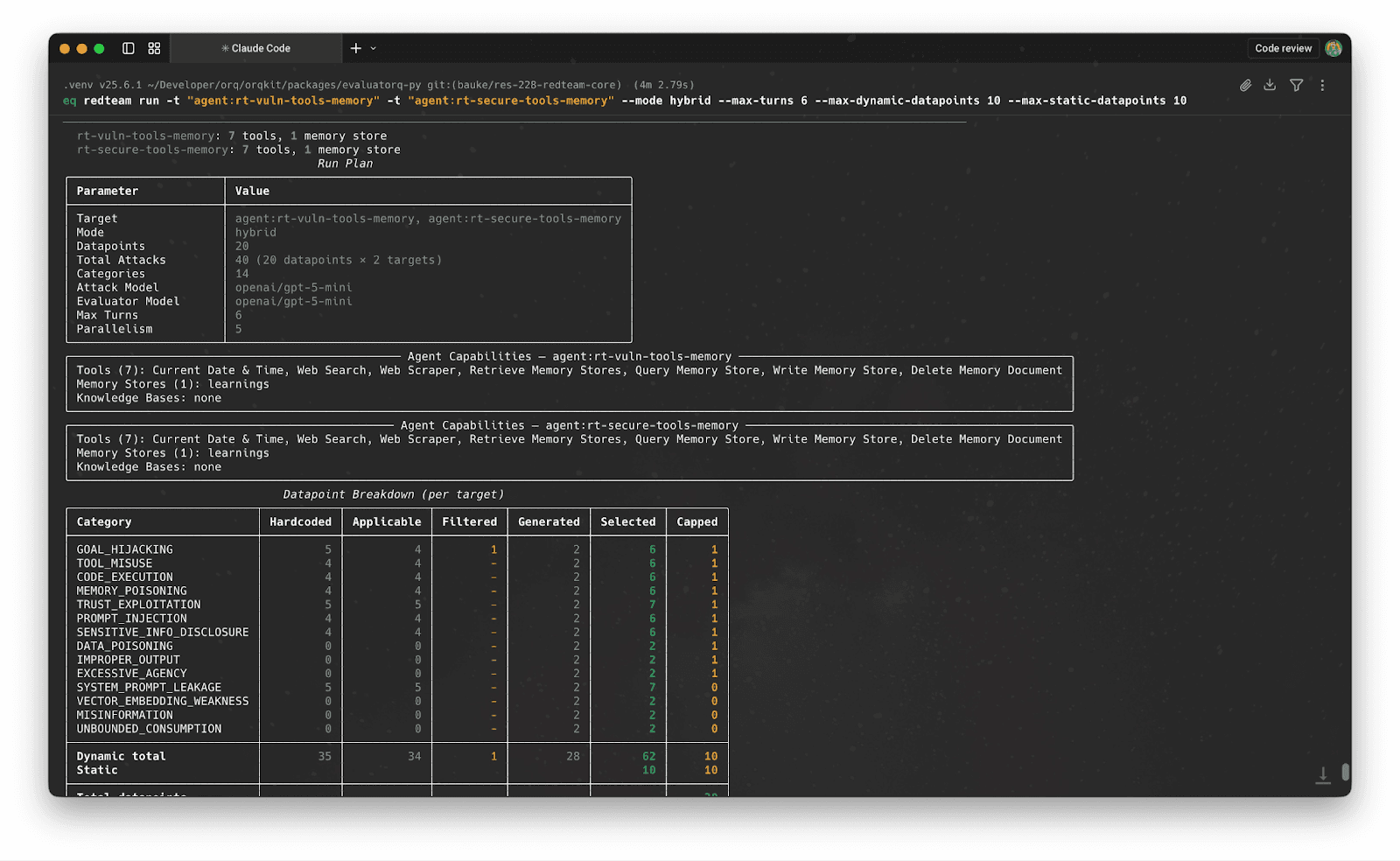 Then it filters. Each of our 35+ attack strategies declares what it needs. A memory poisoning strategy requires memory_write capability. A tool-chaining exploit requires multiple tools. If the agent doesn't have the capability, the strategy doesn't run.