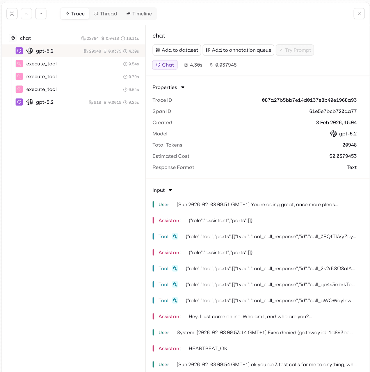 openclaw.agent.turn (root span) +-- chat gpt-5.2 (model inference) +-- execute_tool web_search +-- execute_tool read_file +-- chat gpt-5.2 (second inference call)